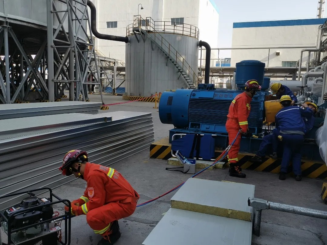 本次演练模拟情景为:气化装置两名巡检人员在巡检过程中,对除氧水泵进行震动测量时,一名操作人员袖口不慎卷入机泵轴承中,另一名操作人员立即停泵并汇报当班班长,班长立即对受伤人员展开救援并进行工艺应急处置,同时汇报调度和中心领导。中心立即启动事故应急救援程序,成立应急救援小组,经过应急救援小组各专业人员的密切配合,受伤人员第一时间救出并送往医院救治,无生命危险,在现场事故处置和工艺处置过程中也未发生火灾、工艺等二次事故,同时,备用除氧水泵及时启动,系统工况回复正常生产,应急救援演练圆满结束。